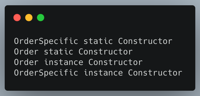 The reason for that is that, in C#, the static constructor is called only when the class is first used. So, in this case, before calling the OrderSpecific instance constructor, the Order instance constructor is called. however, because this is the first time this class is accessed, the static constructor is called first.